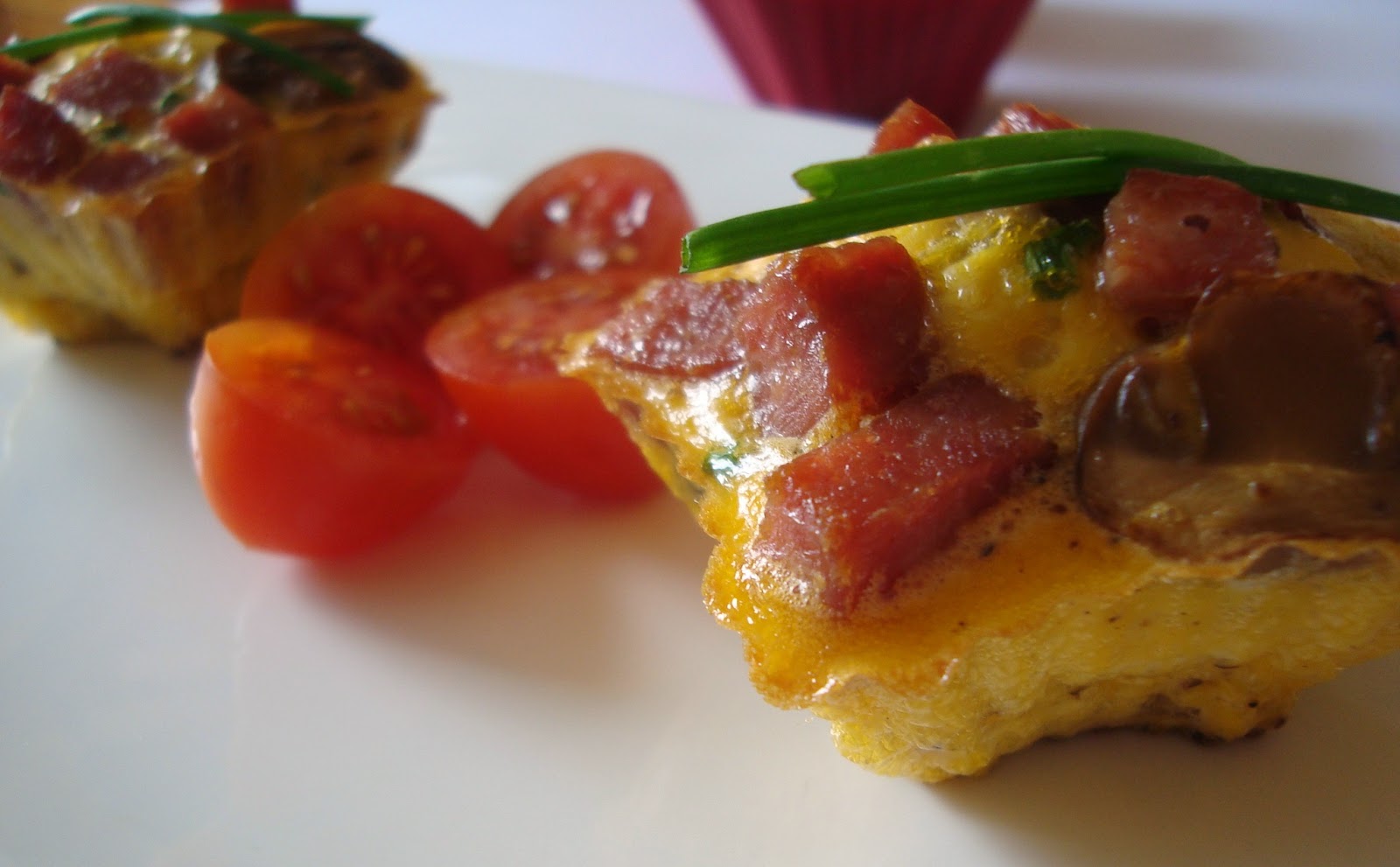 2) Numa taça, bata os ovos, tempere com uma pitada de sal e junte o fiambre e os cogumelos e o cebolinho picado. Misture bem.