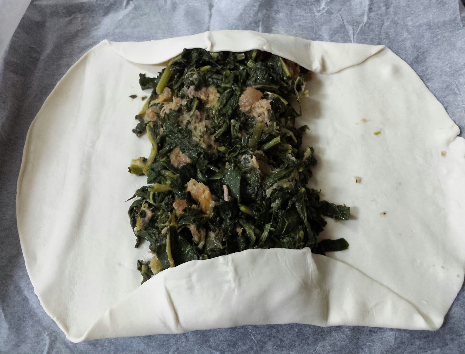 3) Abra a embalagem de massa folhada e estenda a massa, deixando-a ficar sobre o papel em que vem. Coloque o salteado no centro da massa, formando um retângulo. Puxe as pontas mais curtas para cima do salteado. De seguida, puxe uma das outras pontas e depois a outra (ver fotos).